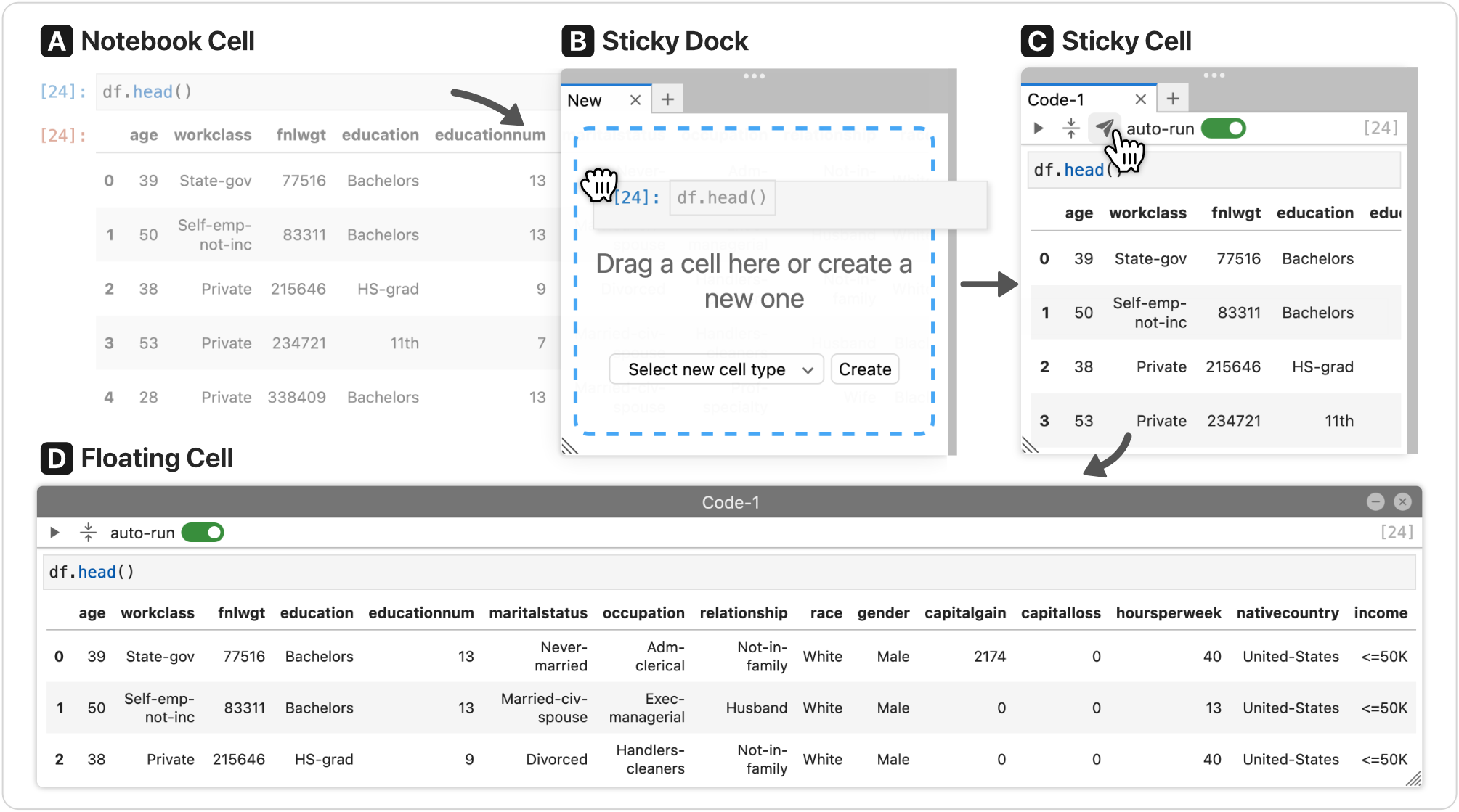 | Drag and drop to create sticky cells | Create sticky code and markdown from scratch |
